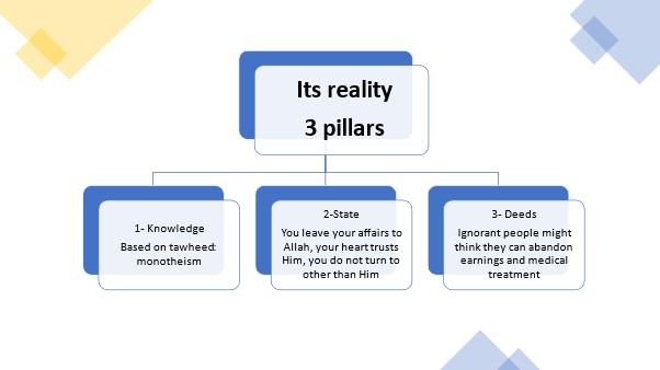 Ghazali looks at tawakkul, breaking it into divisions and levels of tawakkul. The essence of tawakkul is putting your trust in Allah which comes from 3 things: