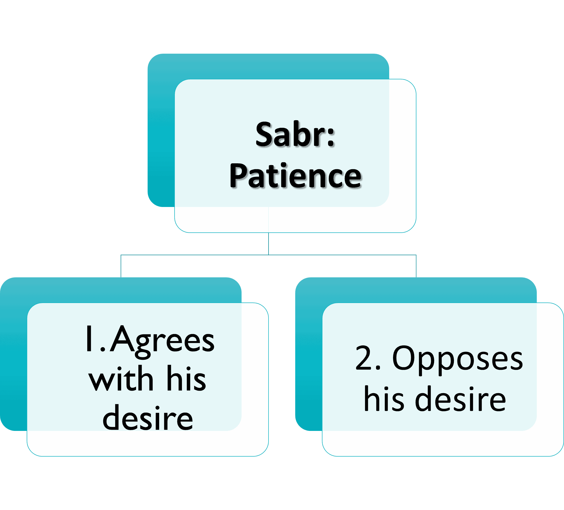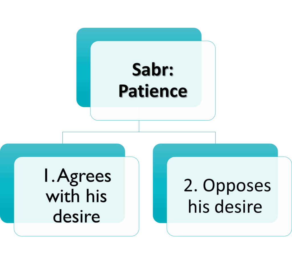 Ghazali’s definition of sabr is the conflict between desire and control. When you can defeat your desire, you reach the point of sabr. The motivation of control comes from Allah, and the motivation for desire is fuelled by Shaytan, who tries to hunt us, trap us and trick us at every corner.