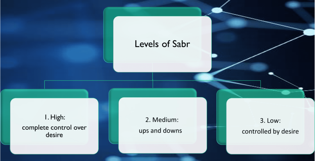 Ghazali delineates three levels of sabr – high level is to have full control, low level is to lack control altogether and to be controlled by desire and the middle level is band that the majority of us fall in – in which we keep trying, slipping up, and trying again. Sometimes we are successful and sometimes we fail, but we keep striving and struggling against bad desires. (We are allowed to fulfil good desires in the way that it pleases Allah).