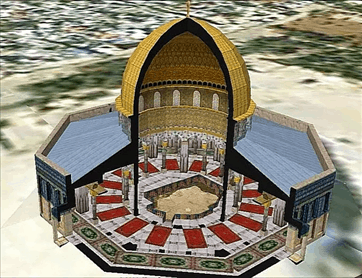 The Dome of the Rock Masjid, contains the rock from which the Prophet (peace be on him) ascended to heaven. Its Arabic name is Qubbat as-Saqqarah. This sits magnificently at the centre of the complex, and is famous for its golden dome.