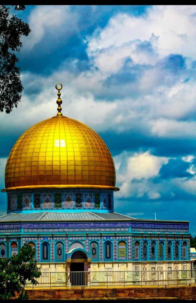 The Blessed Masjid Al-Aqsa sanctuary includes the grey-domed Qibly Masjid, where the Prophet (peace be on him) led all the Prophets (as) in prayer during the miraculous Night Journey (Al-Isra’).