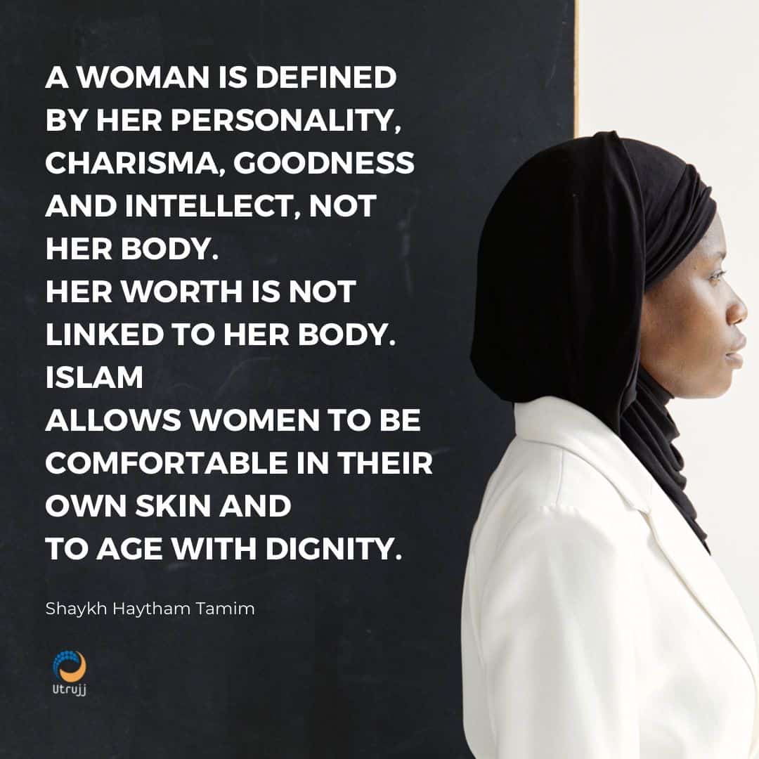 A woman is defined by her personality, charisma, goodness and intellect, not her body. Her worth is not linked to her body. Islam allows women to be comfortable in their own skin and to age with dignity.