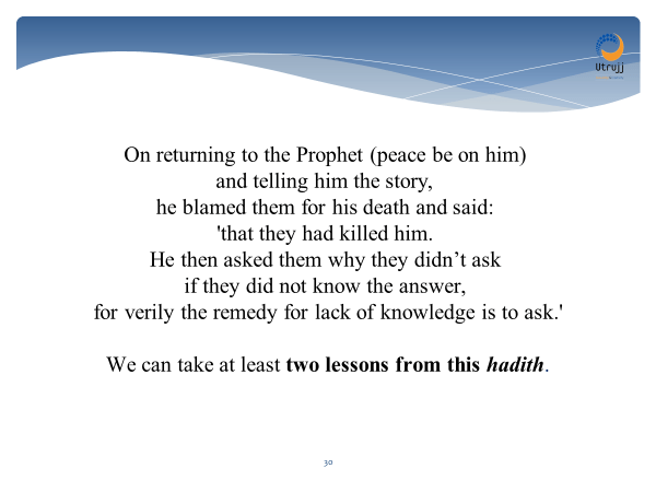 So the wrong fatwa can kill. And the Prophet (peace be on him) made du’a for Allah Almighty to kill them. Though the Prophet (peace be on him) did not literally mean that they should be killed, it was an expression of his anger that they had put themselves in the position of delivering a fatwah without the requisite knowledge. Had they said they did not know, it would have been better for them and their companion. Yet he died due to their ignorance.