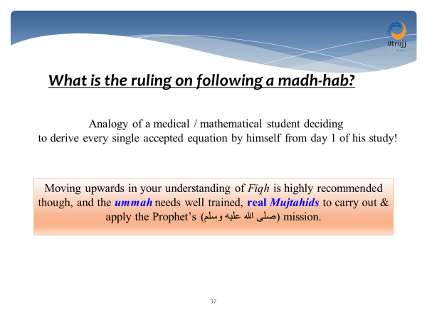Within the same school the mujtahid would renew the religion and give new opinions and choices. For example, Alama Leknawi, the Indian Alama is a Hanafi scholar but has his own ijtihad in the Hanafi school. Not every Hanafi accepts his fatwas because it is against the common fatwas which we are familiar with, so they reject some of his ijtihad, but he was a great muhadith. And similarly we have other mujtahids in other schools, like Ibn Abdul Bar Andalucian scholar in the Maliki school in the 4-5th Hijri.