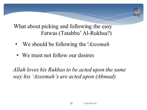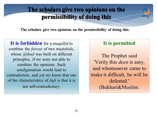 For example, if you have an injury and blood comes out it, it breaks your wudu, unless you are Shafi, and then it does not break your wudu. So you adopt this opinion and then kiss your wife. In the Shafi school, touching your wife breaks your wudu. So if you have taken the Shafi opinion and the Hanafi opinion collectively on the same issue, you have ended contradicting yourself. You have no wudu according to both schools.